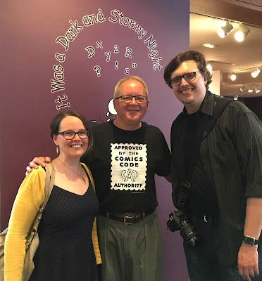 | The Museum hadn't announced that bestselling graphic novelist and my comics buddy Raina Telgemeier would be appearing, so it was a surprise to most of us if not to her. She signed books for several dozen people whose days were made when they found her there. On my other side is cartoonist Andy Runton, whom I'd only met very briefly when he won an Eisner Award in 2006 for his series Owly. I really enjoyed talking with both of them. |