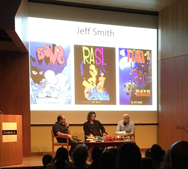 The event's guest of honor was Jeff Smith, creator of the hugely popular Bone series, now available in more than 30 languages worldwide. Jeff did an interview-style panel with the Schulz Studio's Paige Braddock and Lex Fajardo that covered pretty much all of his origin and career. Lex and Paige approached the job from different angles and managed to elicit answers Jeff probably hasn't given a hundred times before. It was a good panel, topped by Jeff being given the Cartoon Art Museum's "Sparky Award," named after Schulz for services to comics above and beyond the call of duty. Jeff seemed genuinely surprised and moved. It was a great moment.
