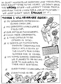 ReplyDeleteHaving lost a home as a young married couple, full of Grandma's stuff, I understood every frame you drew and spoke. It was 1970 in Jamul California. The Laguna fire started 50 miles away, Santa Ana winds. No warning, just RUN on Sunday morning. Your description of the shoppers and your key ring. Completely accurate and full of memories. Thank you for your good work on this. SO expressive. God bless you. Joyce Moser, Burns, Oregon