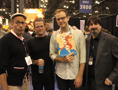 Surfing for an interesting photo of Neil, I found this of three men who contributed to WHTTWOT and one I've seen in his underwear. From right to left are my editor Charlie Kochman, designer Neil Egan, and photographer Geoff Spear, who shot the fine professional photos of the 1939 World's Fair pennant and Futurama pin that illustrate my book. At left is celebrated designer/writer/editor Chip Kidd, who wrote the "Shazam!" book with which they all posed at the 2010 New York Comic-Con. Photo by Abrams's Chad Beckerman, stolen without permission. But we're all pals, right?