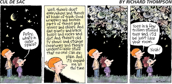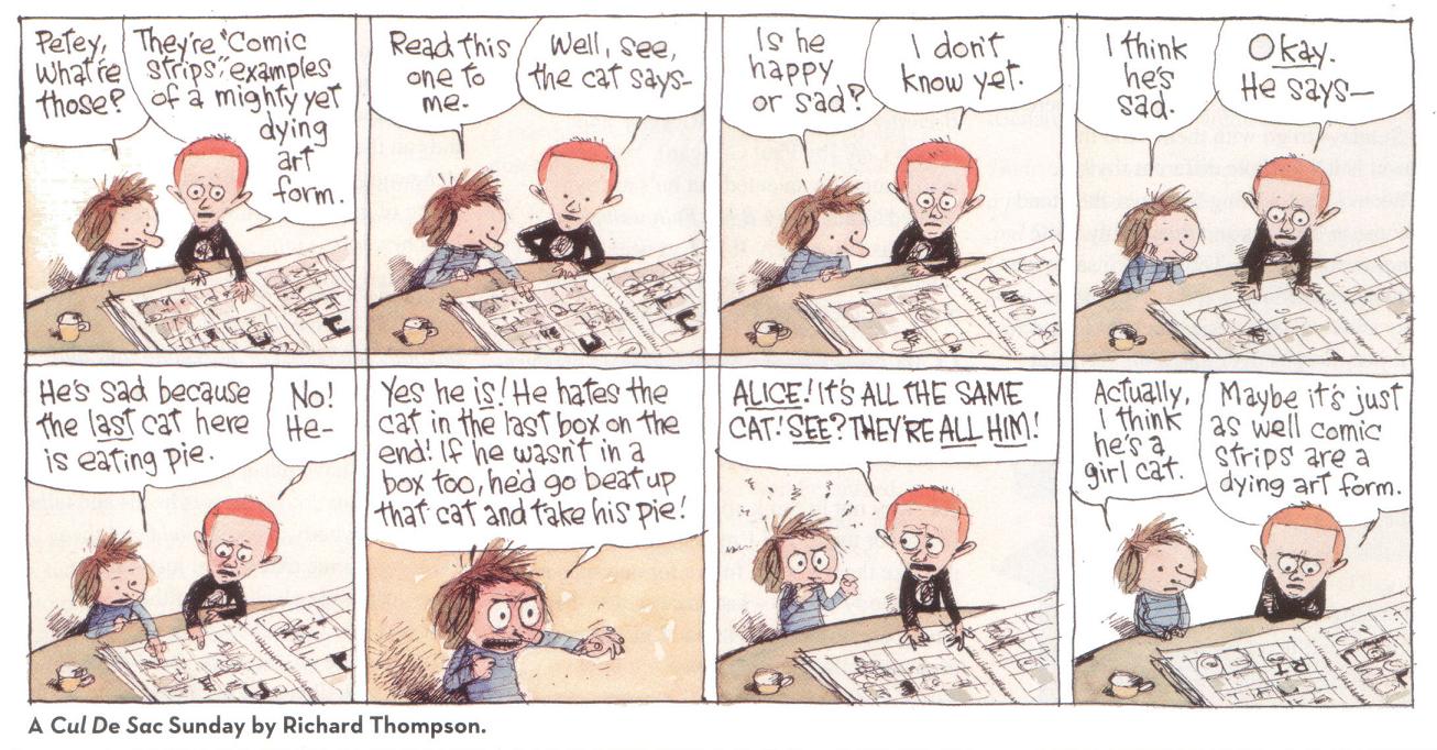 In a recent Facebook note about cartoonist Richard Thompson’s decision to quit doing his comic strip “Cul de Sac,” I called it “the best comic strip being drawn today.” That's not praise I lavish lightly. I mean it. Now I aim to defend that opinion.
