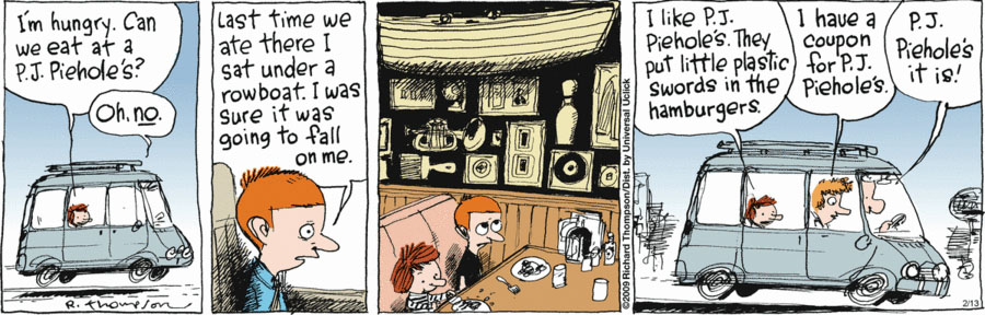 "P.J. Piehole's" is funny. Petey's neurotic fear of being crushed by restaurant decor is funny. But the best part is his family's total indifference to his terror. That's a lot of funny (and a little bittersweetness) packed into four panels.
