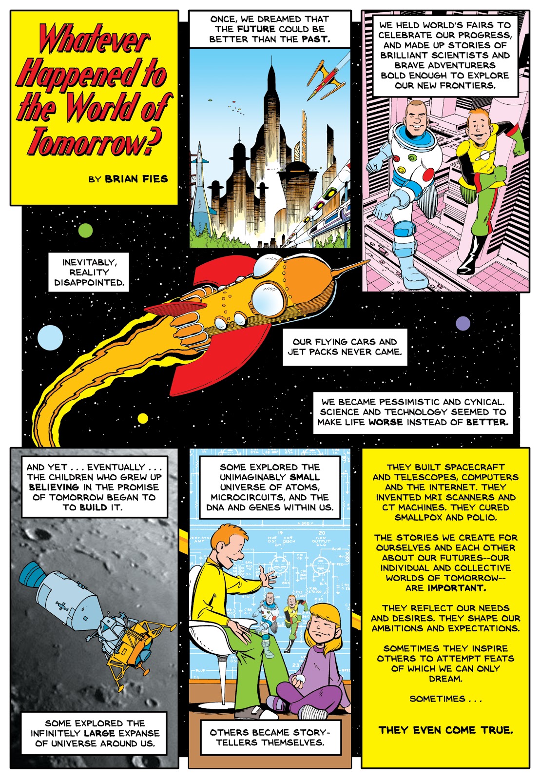 Back in September I was a guest on Jordan Rich's late-night radio talk show on Boston's WBZ and the CBS Radio Network. I mentioned afterward that Jordan had asked me to contribute to his annual For the Children fundraising booklet, which he's produced for 13 years to benefit Boston Children's Hospital. It's a collection of recipes, inspirational essays, poems, artwork and such provided by Jordan's guests and friends. Jordan asked if he could reproduce a page from Whatever Happened to the World of Tomorrow. Instead, I put together a new piece that I think distills its optimistic message. Here's a teaser: