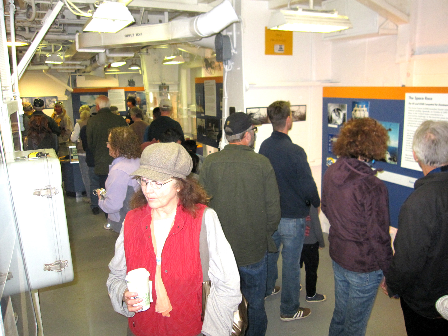 I surprised my daughters, Laura (the museum collections manager) and Robin (Hornet volunteer and loyal assistant), by driving down for the big unveiling. The Apollo Exhibit was scheduled to open at 3 p.m. I showed up around 1 p.m. and poked my head in the door; they were startled and happy to see me for about 10 seconds and then put me to work. They still had a lot to do. We polished everything as best we could, grabbed a quick lunch on the historic carrier's Flight Deck while watching a series of impressive ceremonial flyovers by vintage aircraft, then ran back down for the ribbon-cutting.