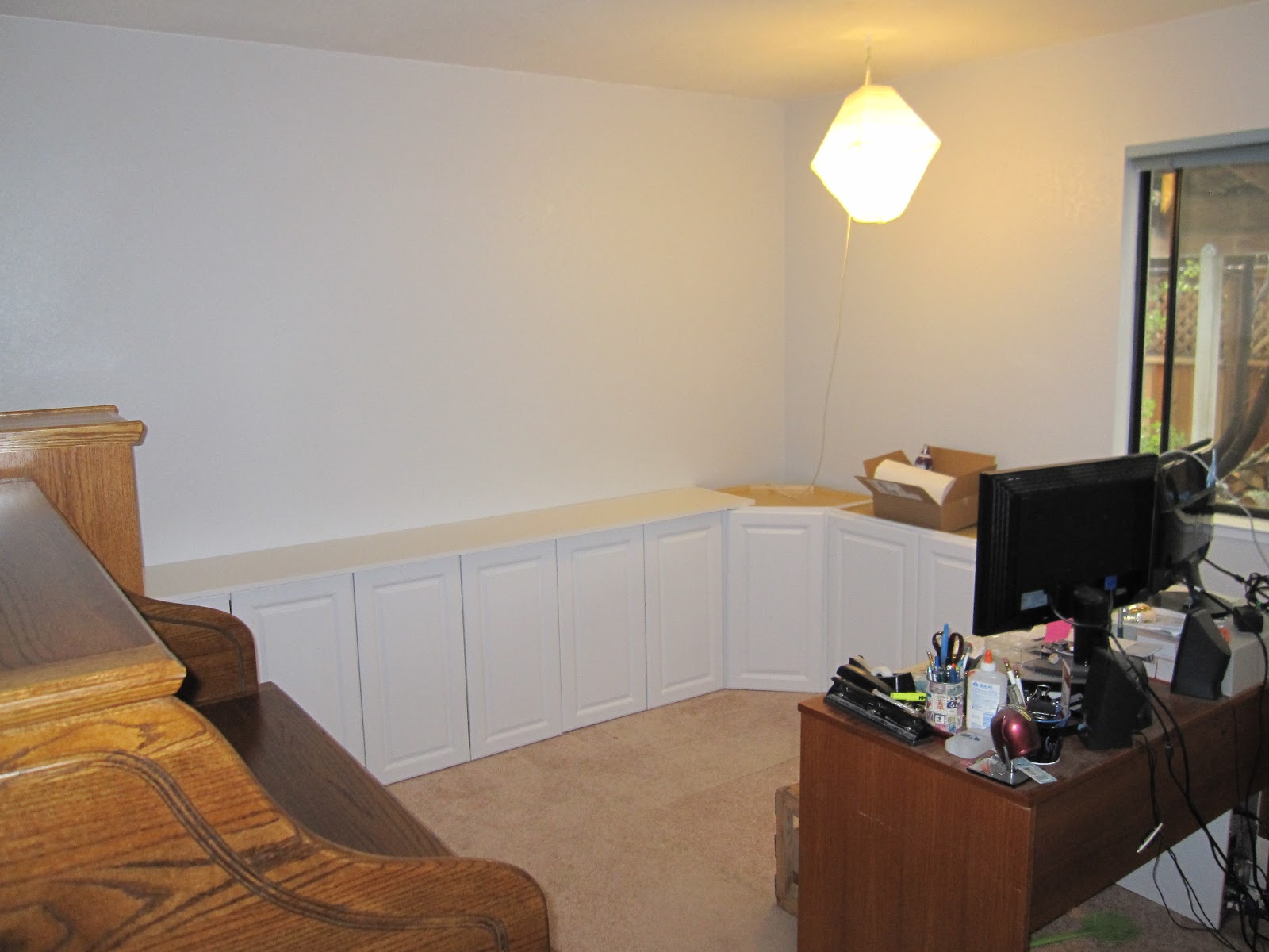 The goal is a neat, clean office with crisp light gray walls and white ceiling and trim. We can't move the furniture around too much--it'll only fit and function configured as it is--but we're going to install cabinets for more storage and construct a built-in bookcase on top of them along the entire length of the back wall. If my calculations are right our bookcase capacity will increase slightly but we're still going to have to get rid of some books. We'll find them good homes.