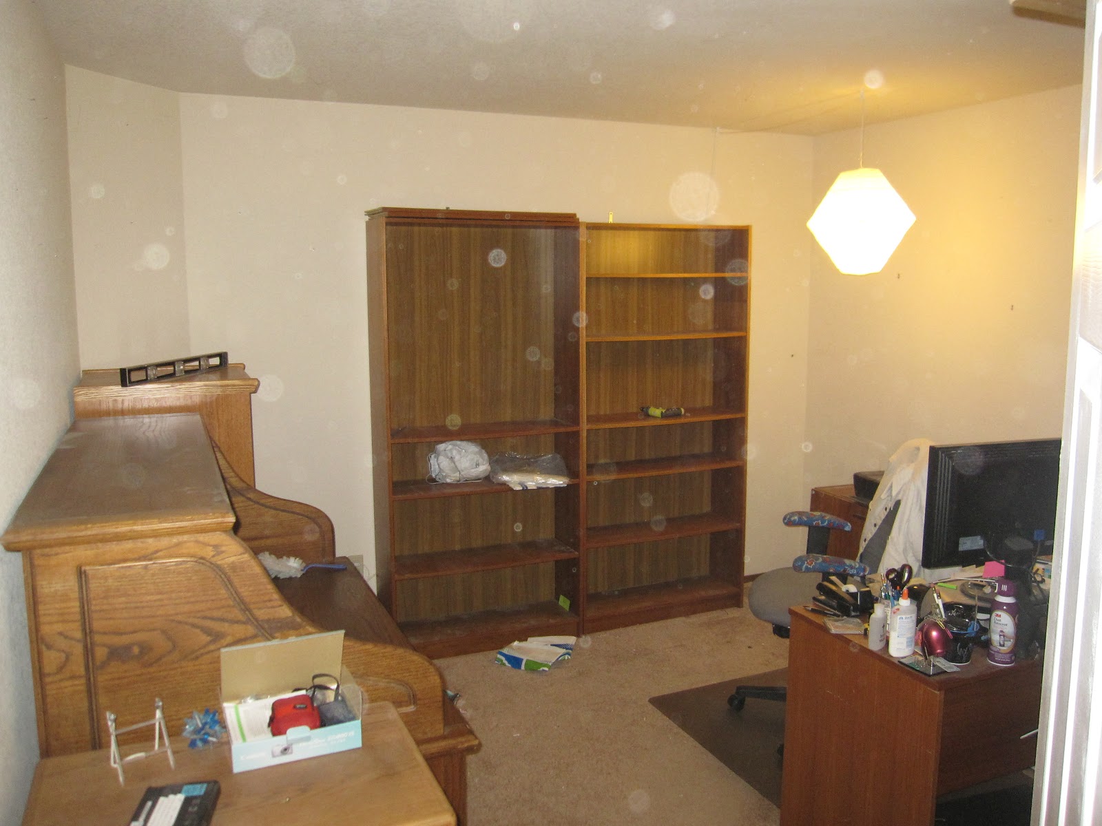| The room tonight. We'll pull out the bookcases and some other furniture in the morning, move the big stuff into the middle of the room, and start painting tomorrow. If we're able to move. |