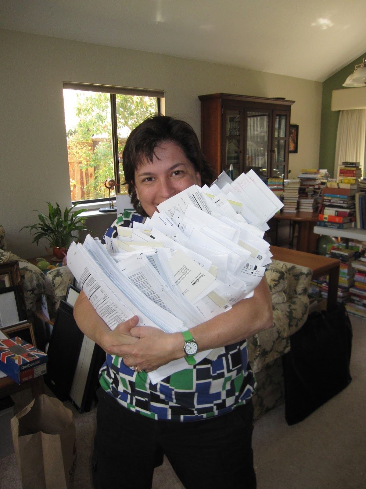 | Speaking of Karen, she's behind that heap o' recycling somewhere. Behind her you can see the books beginning to pile up on and around our dining room table. It got worse. Much worse. |