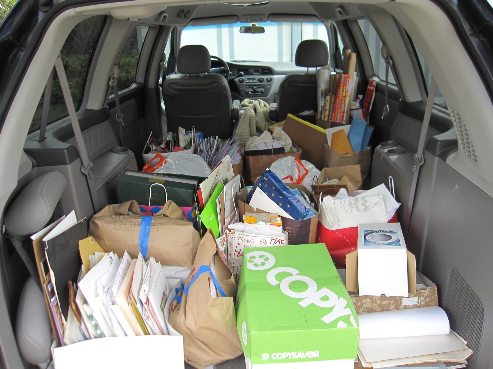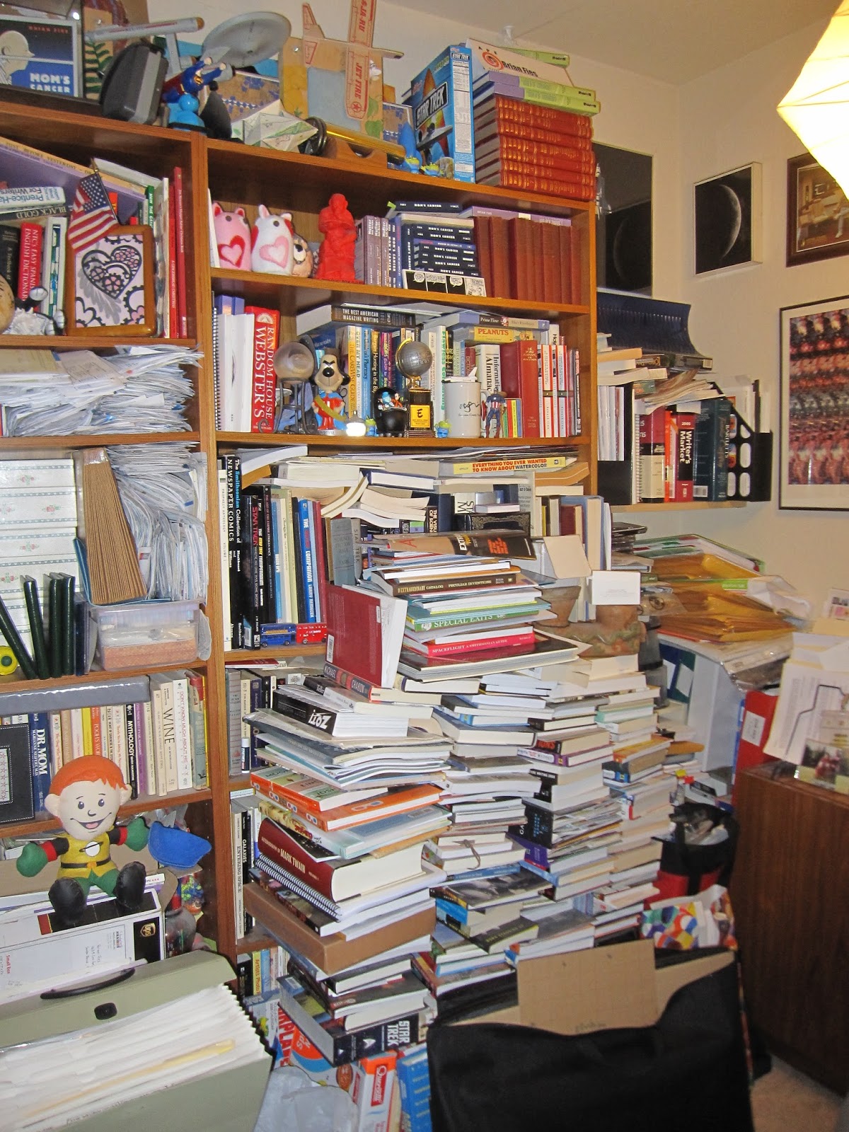 Karen and I just finished emptying it at the end of Day 3. It took a while because Karen set the very reasonable course of sorting through everything on the way out, rather than getting it all out and editing it later. So we thumbed through piles, poked through files, and overfilled two large rooms with the contents of one small one. Relieved of its cork, the office exploded like Mentos out of a bottle of Diet Pepsi.