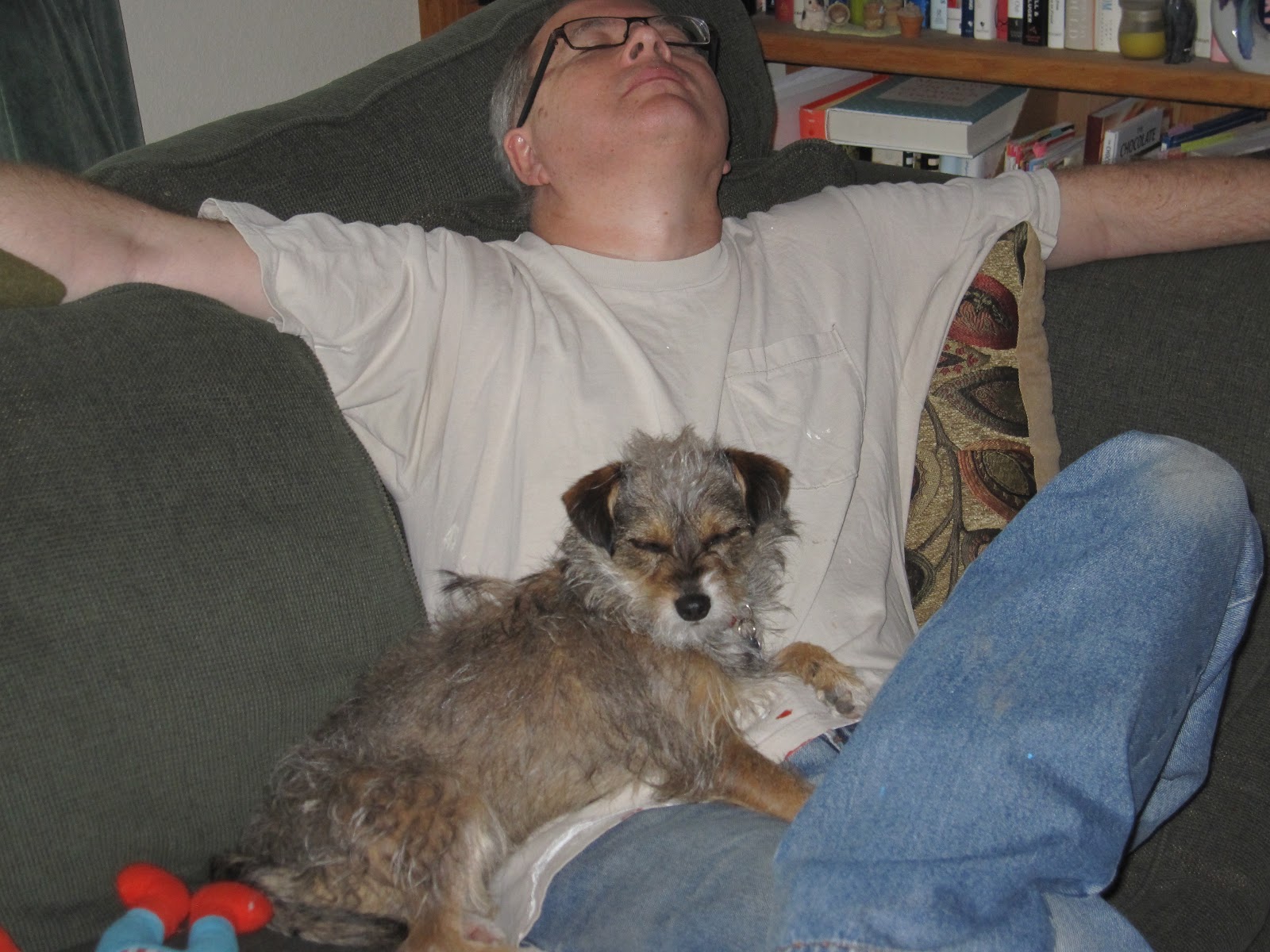 | Man and dog, both exhausted by their day's labors. |