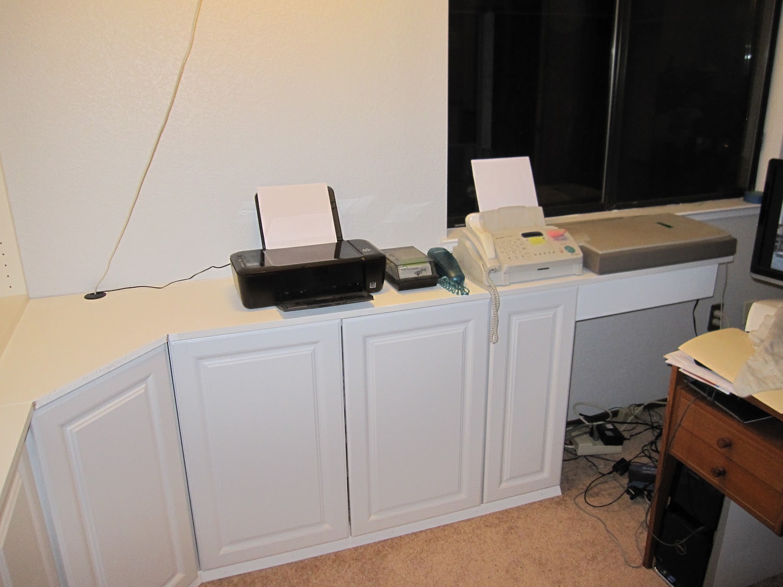 Since my last office/studio renovation update on Wednesday, Karen and I have continued to make progress. Some of it is the sort of progress that isn't very showy: countersinking, spackling and painting finishing nails, etc. The kind of stuff you can spend an hour on and no one will ever notice but you'll know it was done right (or at least as best you could). Still: shelves are built and in place (securely, here in earthquake country) and we actually began loading some things into the cabinets tonight. It's beginning to pay off.