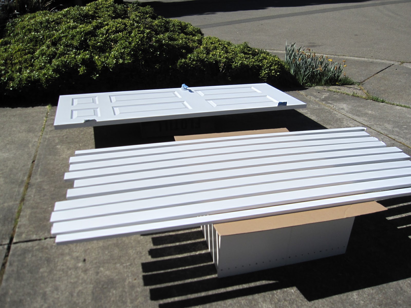 | Various bits of trim and a door drying in the driveway after being painted white by Karen. There's a LOT of trim. |