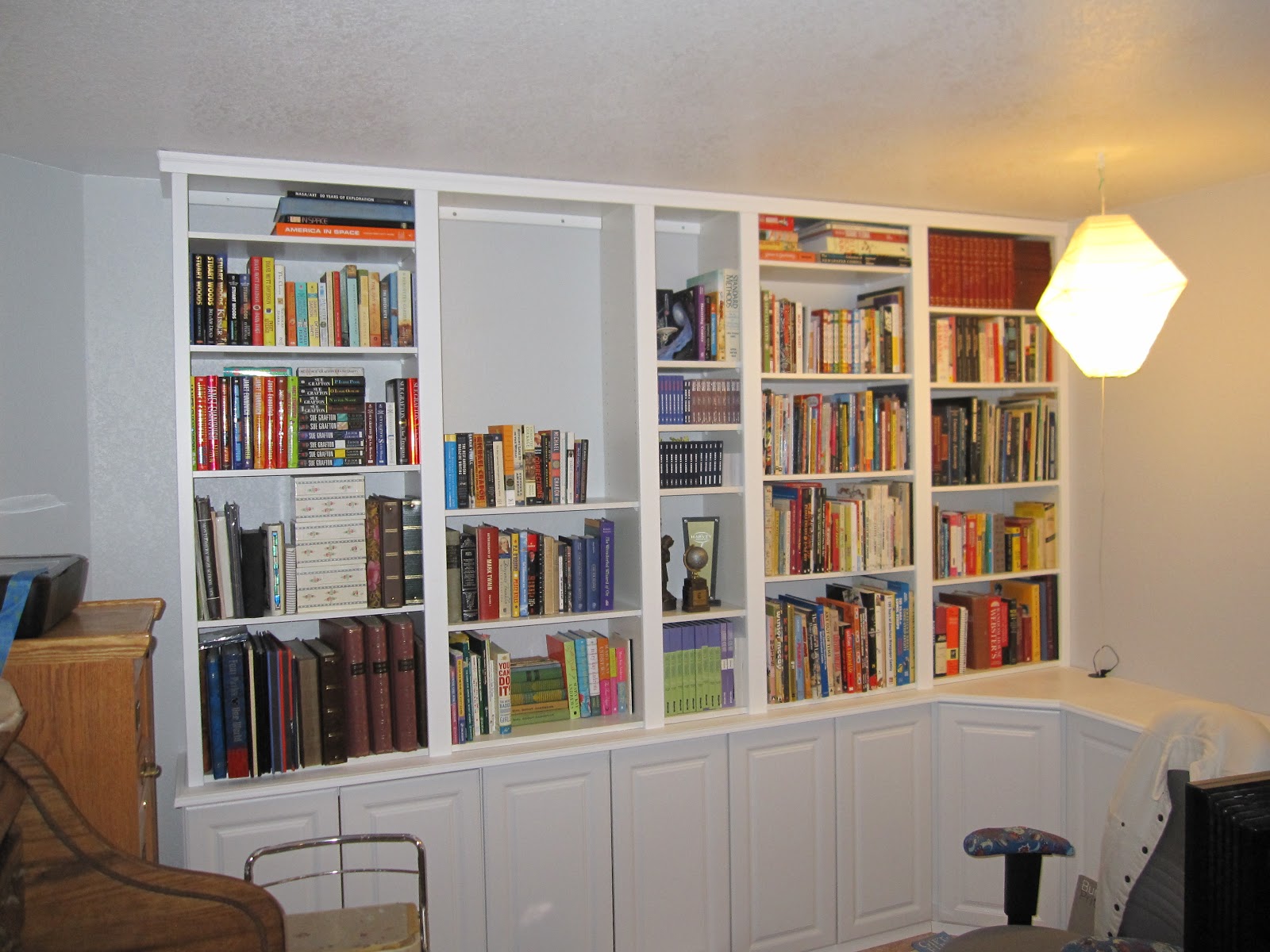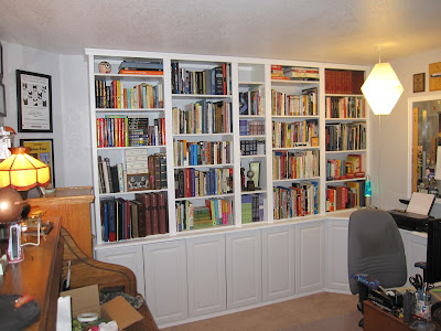 | Bookshelves partially loaded. I've got quite a few more than will fit the available space. Some will probably end up in a cabinet underneath. |