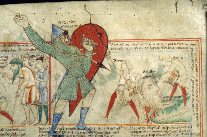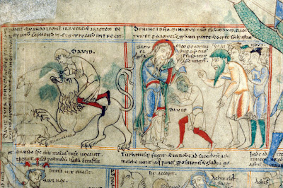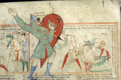 You read it left to right, top to bottom. It's got panels (boxes), descriptive captions, characters' speech floating around their heads--no word balloons, but you can't have everything. And that bottom picture of David and Goliath, with Goliath's enormous size emphasized by drawing him not only bursting through the panel boundary but far into the border with his spear off the very edge of the page itself, is like something Jack Kirby might've drawn (also notice David's sling snapping toward the top of the page). Goliath looks stunned to find a stone embedded in his forehead in mid-strike. It's magnificent! This anonymous artist wasn't just some primitive proto-cartoonist, he was actually good!