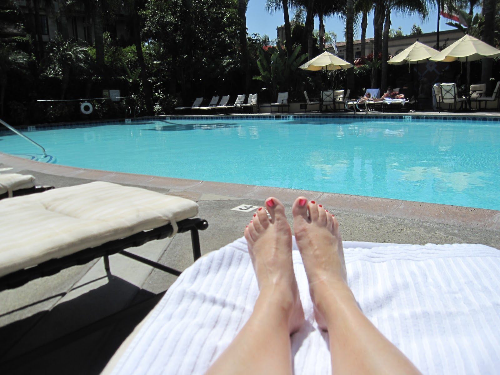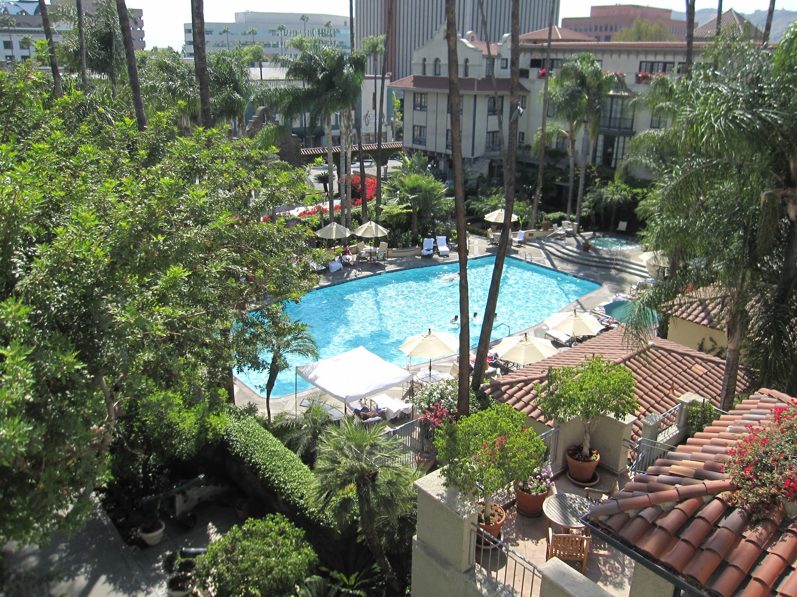| The Mission Inn pool, with downtown Riverside in the background. The weather was sunny and warm, perfect for a margarita by the pool (so I hear) |