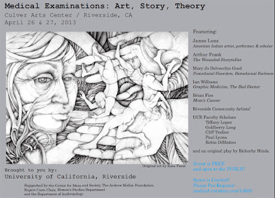 Got home from last weekend's "Medical Examinations" conference at UC Riverside and spent Monday catching up on missed work. Good conference! Especially for the first of its kind. In contrast to the Graphic Medicine conferences I've been involved with, this one dealt with storytelling in a broader sense, with a sort of anthropological academic perspective. Art, theater, history, literature, Native American prayer, comics: it's all good.
