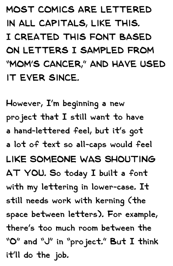 A word about lettering: I do it digitally now. I didn't used to; Mom's Cancer is all hand-lettered right on the original artwork, just as it appears in the book. In fact, it's that experience that converted me to digital. Hand lettering is very hard to edit--you have to rewrite it and try to take up the same amount of space. It's hard to lengthen or shorten. When it comes time to translate a comic into foreign languages, you have to go through and delete the text from each individual word balloon and caption so it can be replaced. Far easier--far, far easier--to edit at the speed of typing, lengthen or shorten at will, and delete at the touch of a keystroke. The lettering is still mine. I sampled letters from Mom's Cancer to create my own font/typeface. I wrote a much more detailed blog post about that process a few years ago.